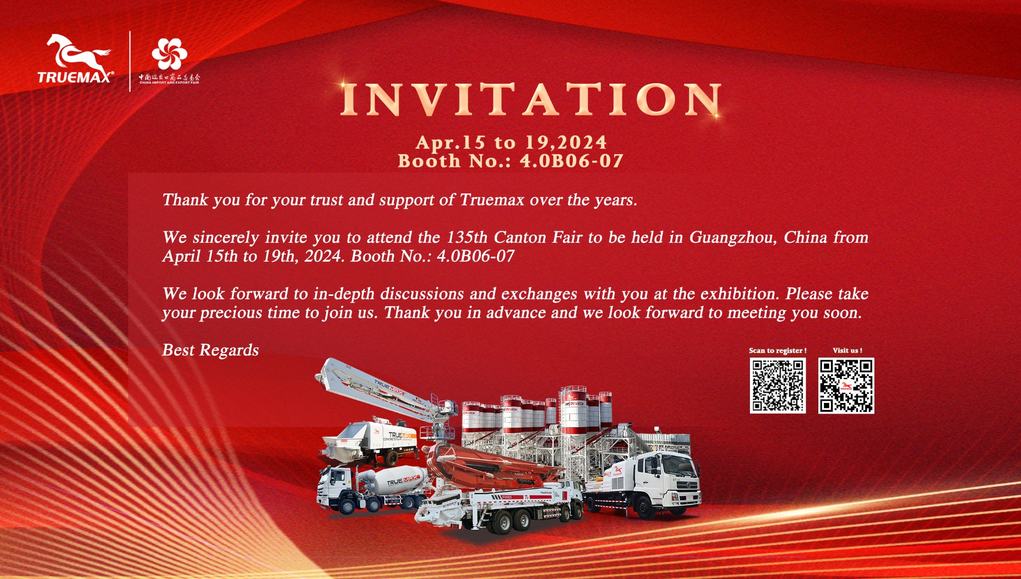 We sincerely invite you to attend the 135th Canton Fair to be held in Guangzhou,?China from April 15th to 19th, 2024?Booth No.: 4.0B06-07?We look forward to in-depth discussions and exc